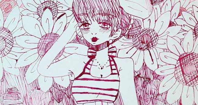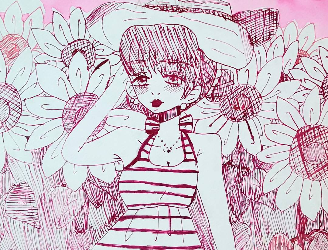 ホワイトとガラスペンで、ひまわり畑に吹く風になびいている女性を描いてみました。