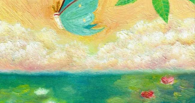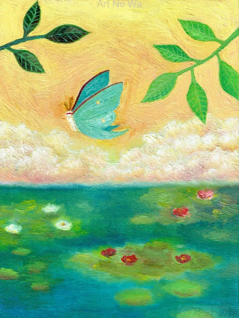 オオミズアオが睡蓮の上を舞う、夏の日の風景を描きました。