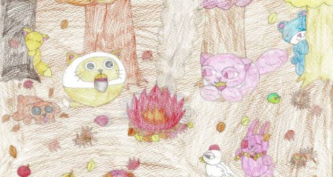 校長たちが秋の森で遊んでいます。校長とキャサリンは焚火で焼き芋を作っています。犬の「らんちゃん」は木の実や葉っぱでおしゃれをしています。かえるの「げこすけ」とひよこは葉っぱの中で遊んでいます。にわとりの「コッコちゃん」はみんなを見守っています。きつねの「コンちゃん」とくまの「どんちゃん」は、木のかげで遊んでいます。