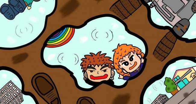 雨上がりに水溜まりを除く男の子と女の子を主に水溜まりから見える景色をイラストにしました。嫌な雨も上がり始め、さわやかな気持ちで男の子と女の子は水溜まりを除いています。雨上がりってなんだか良い気分になりますよね
