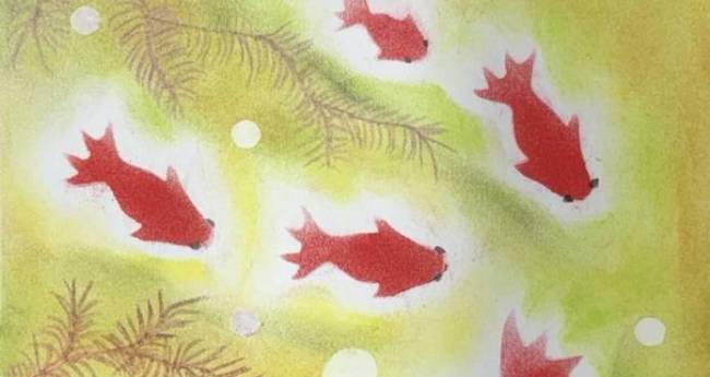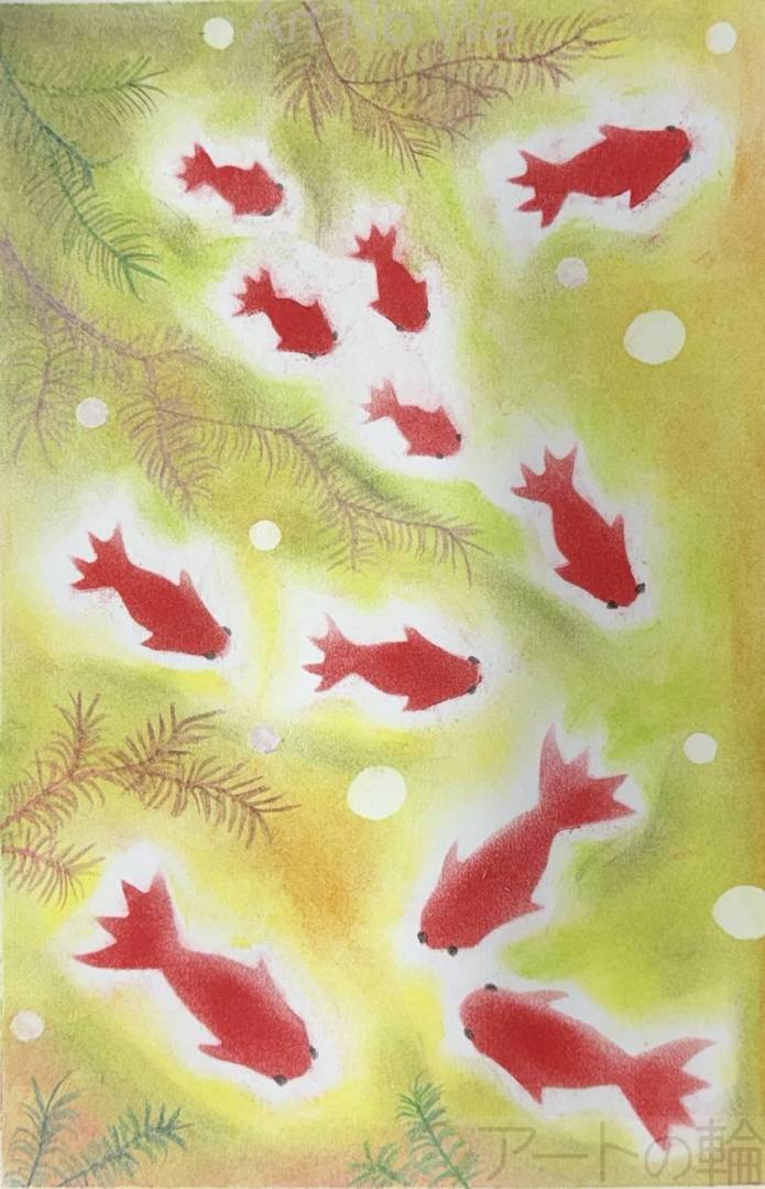 親金魚から生まれた子金魚も大きくなりさらにその子金魚が生まれ増えてあふれ出しそうな位 3世代の金魚をかきました。