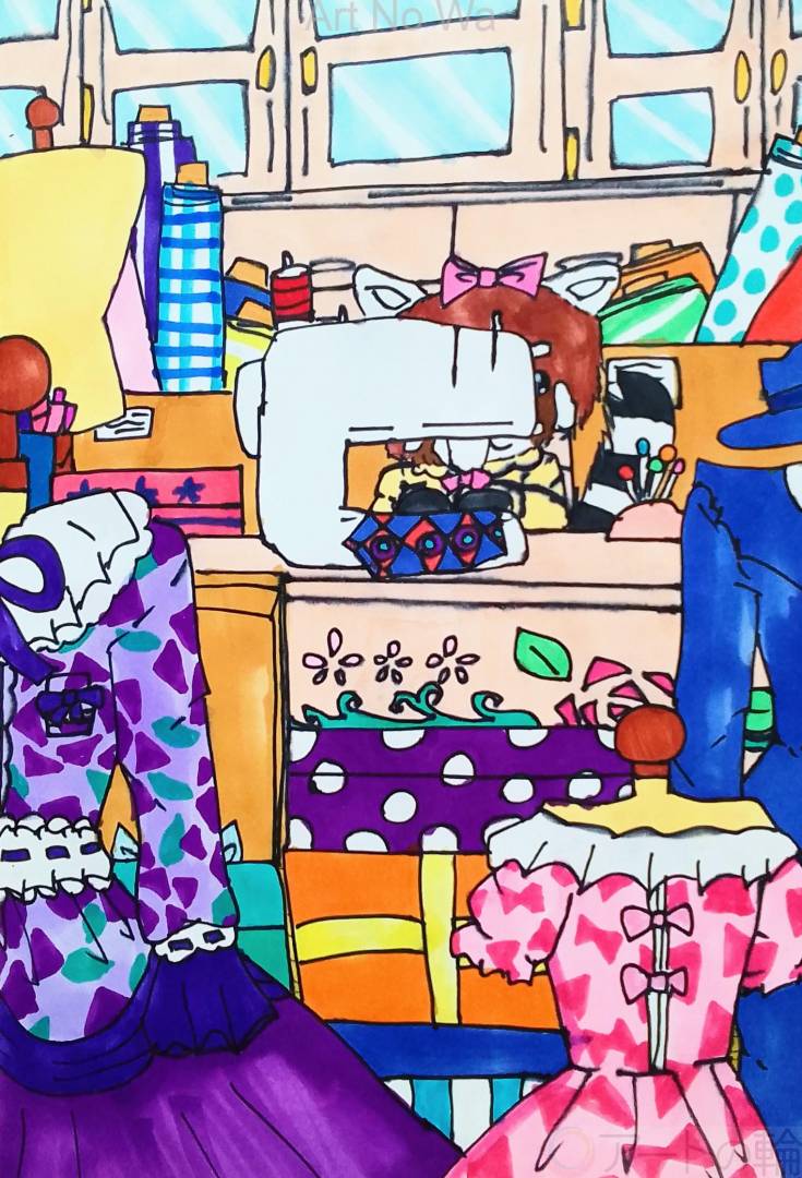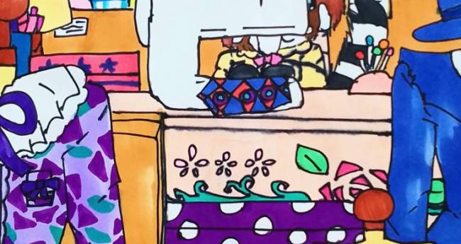 レッサーパンダの女の子が、服を作っている様子を描いてみました。
