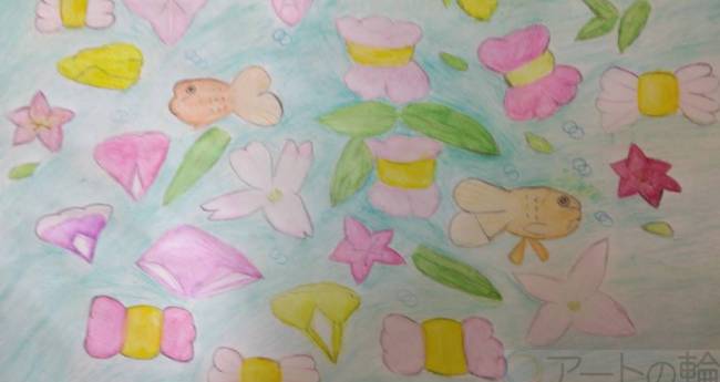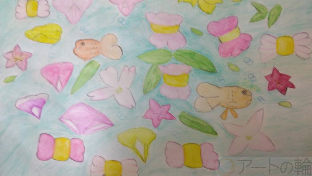 “金魚草等のお花から魚が泳ぐ水槽を連想して描きました。 “
