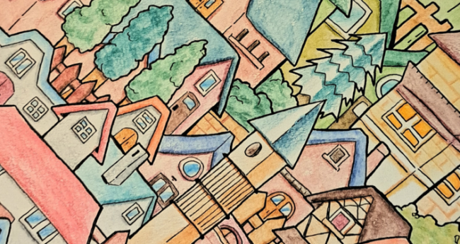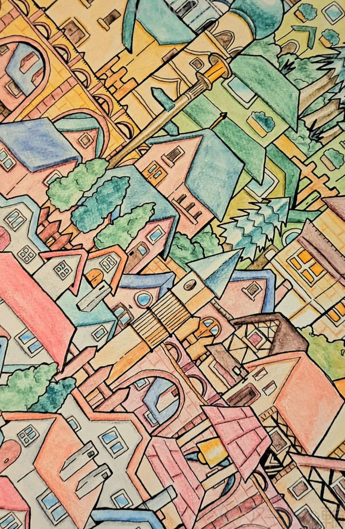 水彩色鉛筆とペンで街並みを描きました。こだわったところは、一つ一つのお家の形や色などを変えて個性を出したところです。