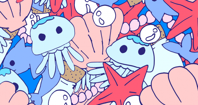 夏っぽく青い線画にして、海の生き物や真珠などを沢山描いてみました!