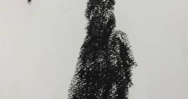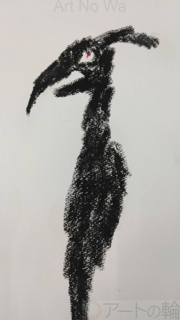 ひとりの人とも鴉とも区別のつかない生物が横を向いて立っている