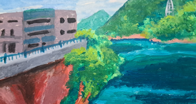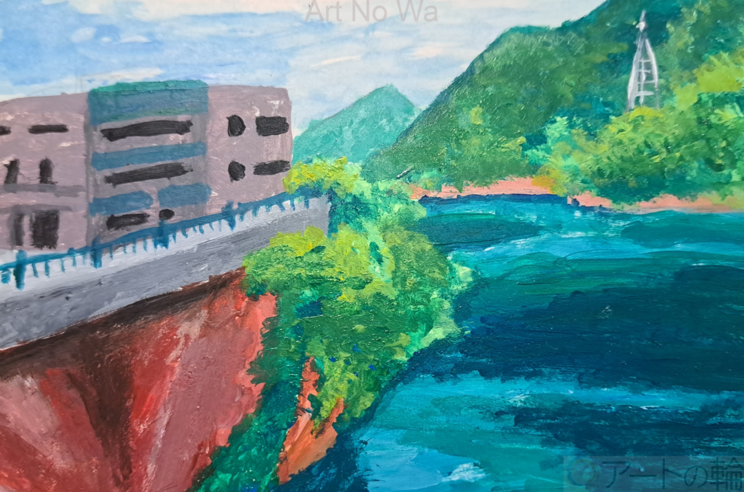 ダムから見える景色を描きました、こだわったところは水面の濃淡です。