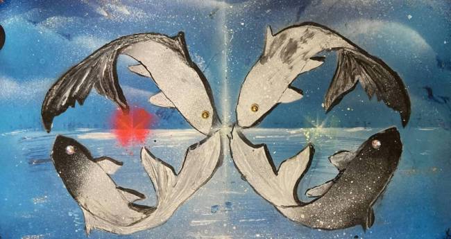 非現実,自然,海,空,過去,現在,未来,太古,お盆,青,白,黒,想像上の生き物,記号,星,2D