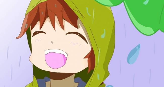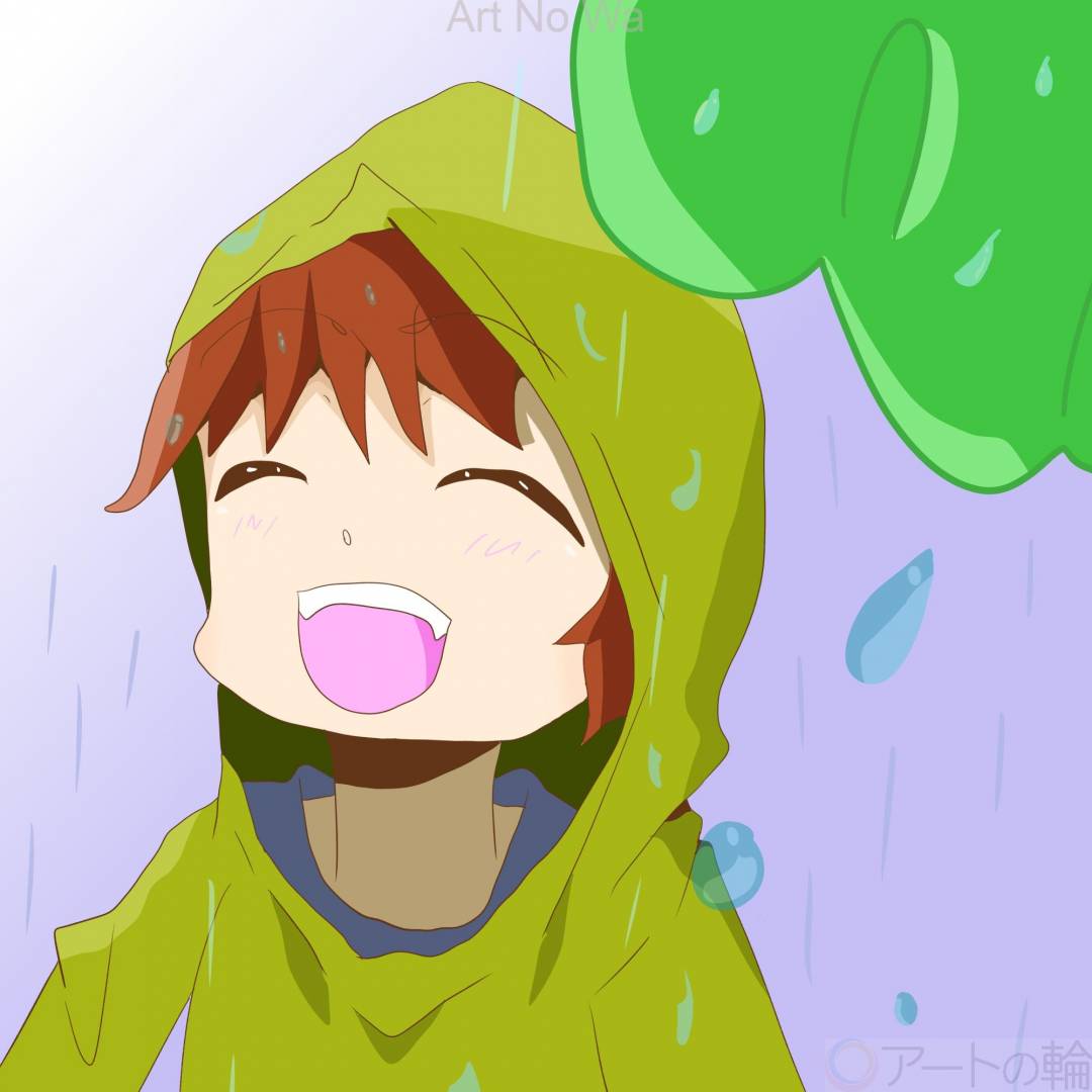 梅雨の時期を楽しむ子どもの笑顔を描きました。