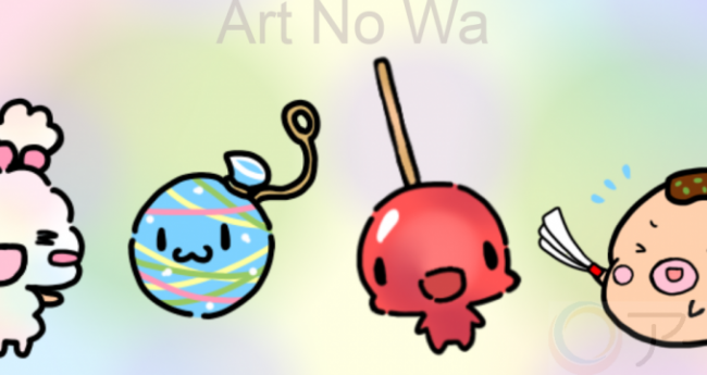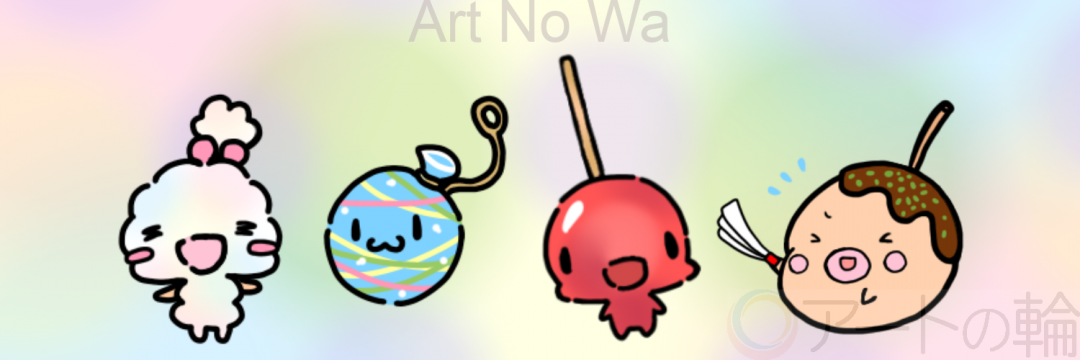 左から わたあめの「わためちゃん」ヨーヨーの「ボヨヨ君」りんご飴の「りんちゃん」たこ焼きの「タコ丸君」