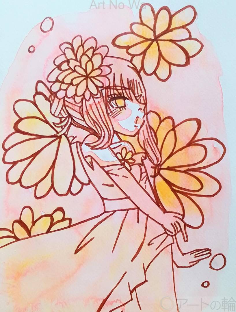マリーゴールドの花のドレスを着ている気品あふれる女性を描いてみました。