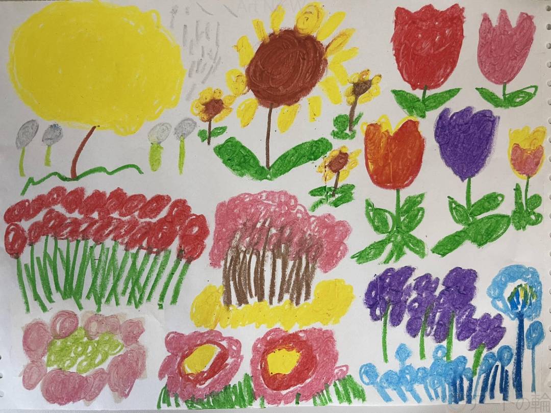 すきなむげんの花。ぼくはかんがえたのはコスモスやたんぽぽやスイートピーや桜など花のしゅるいをすきな花のイメージしました。