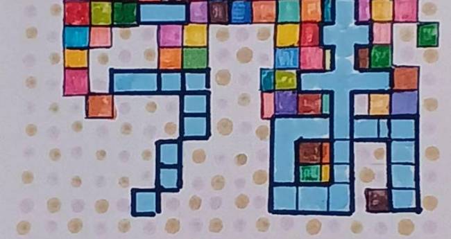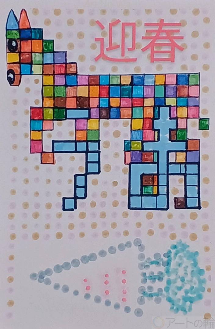 小さい正方形の中を色々な色で染め この馬之助が誕生しました。身体のなかにも(うま)という文字も入れています。大きい身体の動物ですが、目がとてもきれい と聞いています。馬の目のように 澄みきった心で、またカラフル馬之助のように色々なことにチャレンジする新しい年を迎えてもらいたいと思い、描きました。
