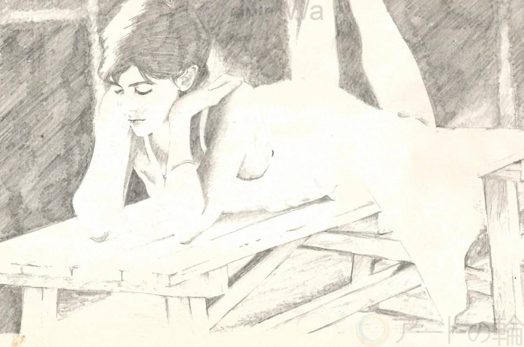 白いドレスを着た女がベンチで横たわっている。日光を浴びてドレスだけが白く浮き上がっている。夏の庭の光景。