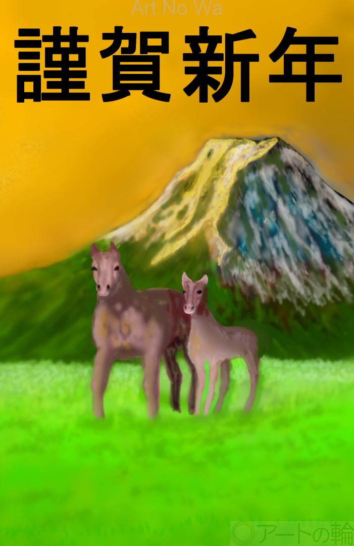 富士山、朝焼け、馬で2026年の正月を描きました。