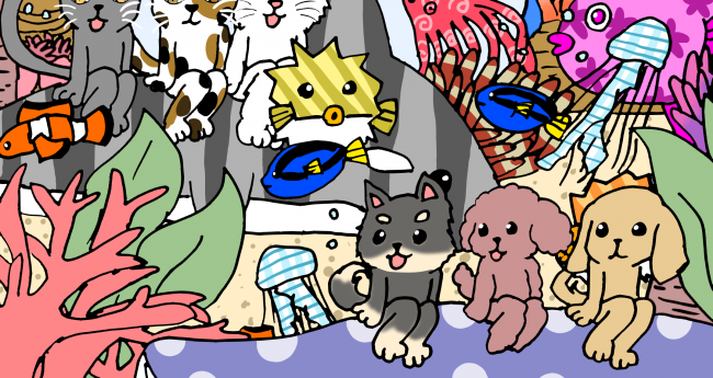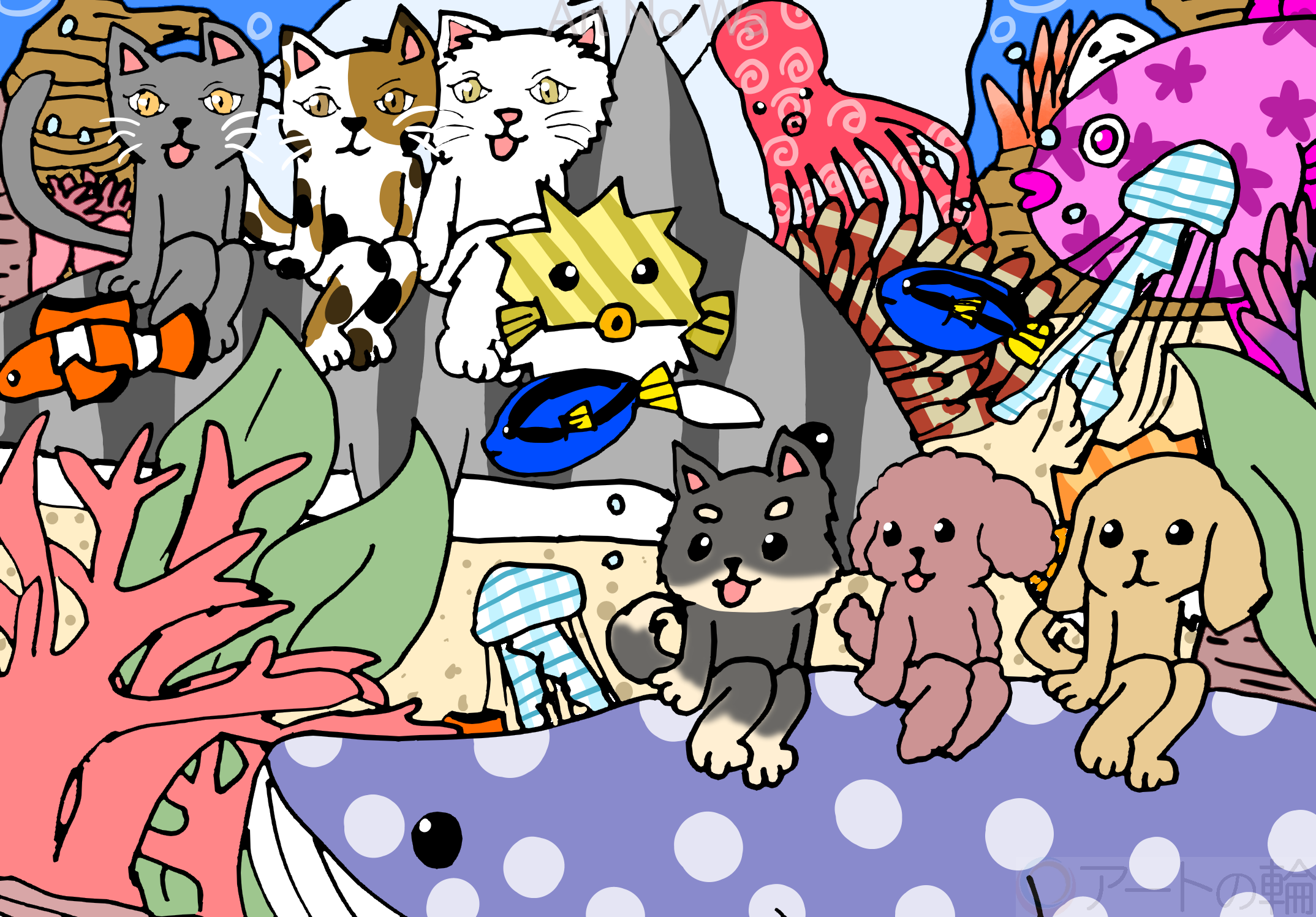 犬と猫がクジラやシャチに乗って、海を大冒険している様子を描いてみました。