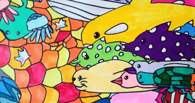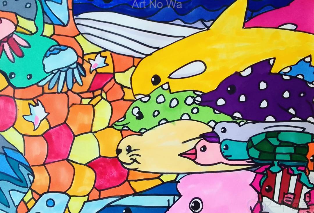 色んな海の生き物達が泳いで駆けている様子を描いてみました。