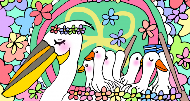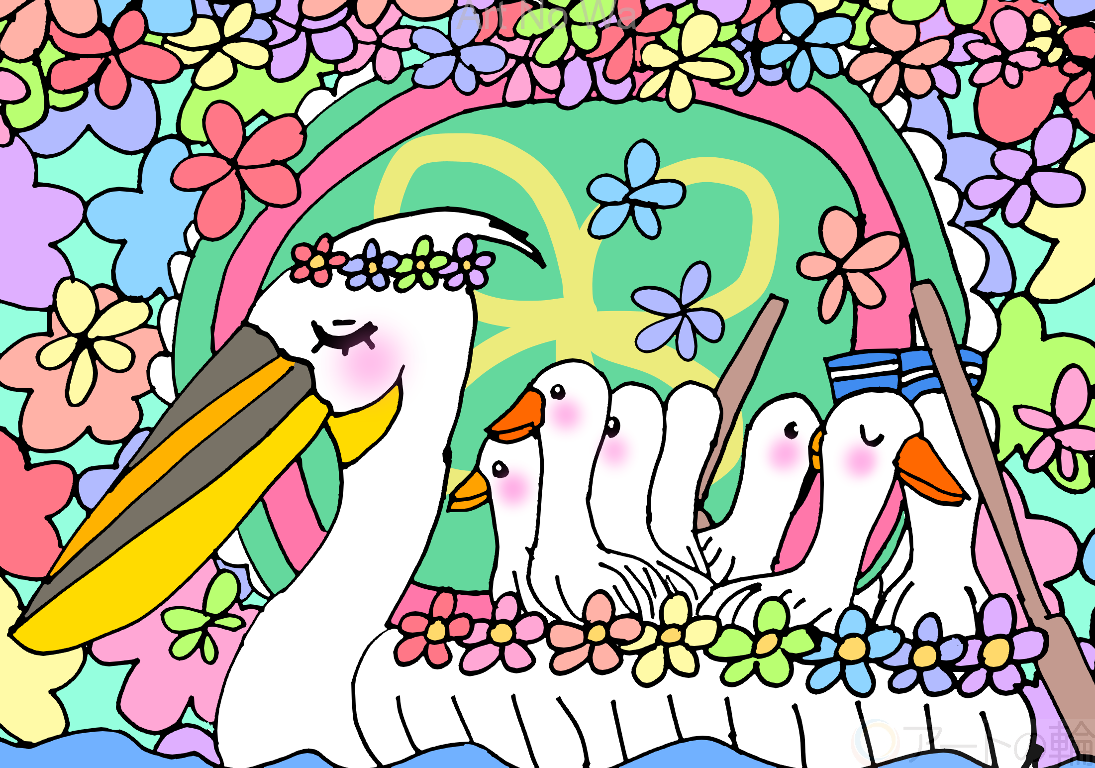 ペリカンのボートにガチョウ達が乗ったり運転している様子を描いてみました。