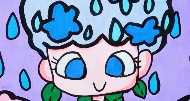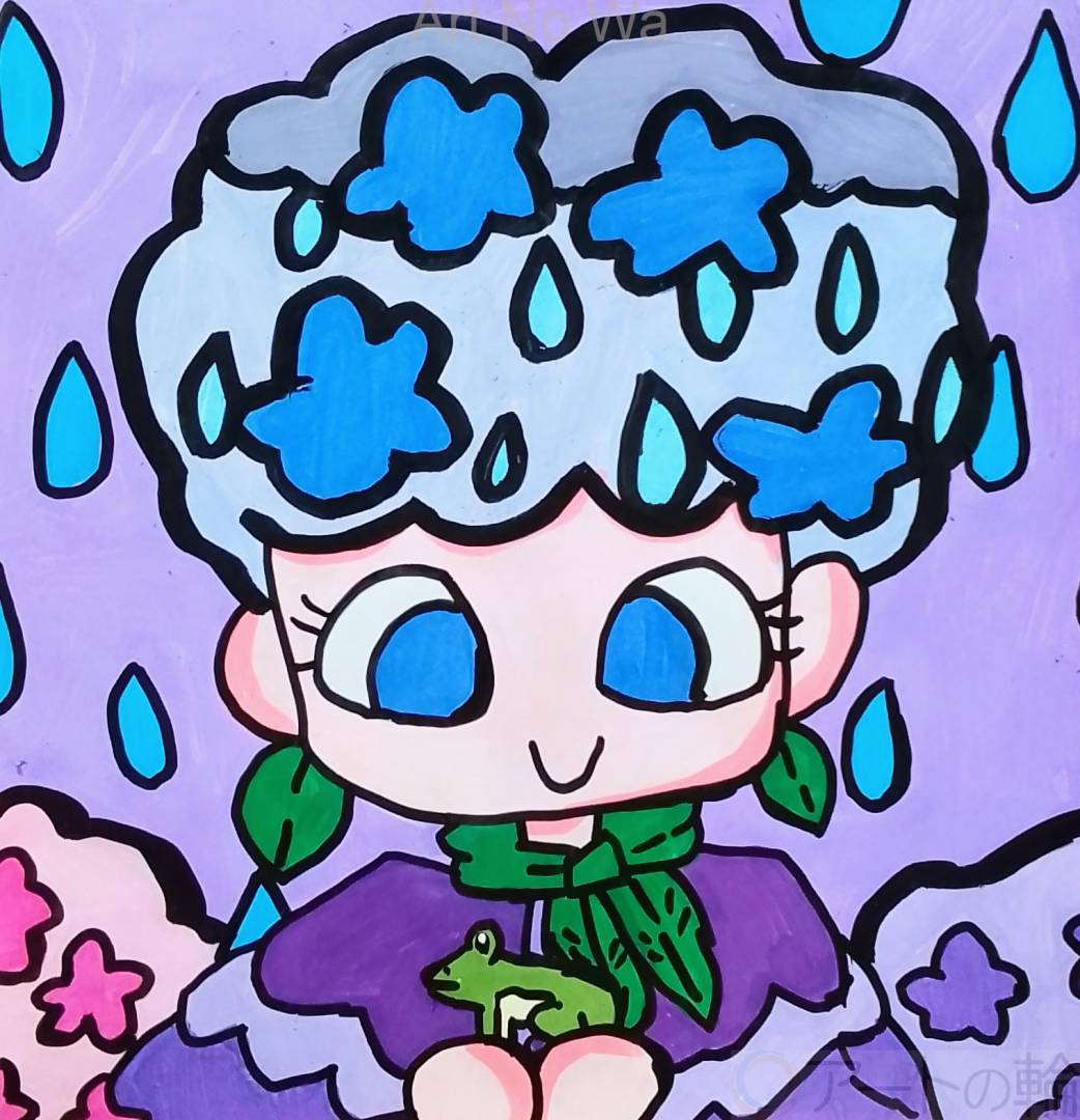 紫陽花の花のアフロの髪型の女の子がカエルと梅雨の雨の中楽しんでいる様子を描いてみました