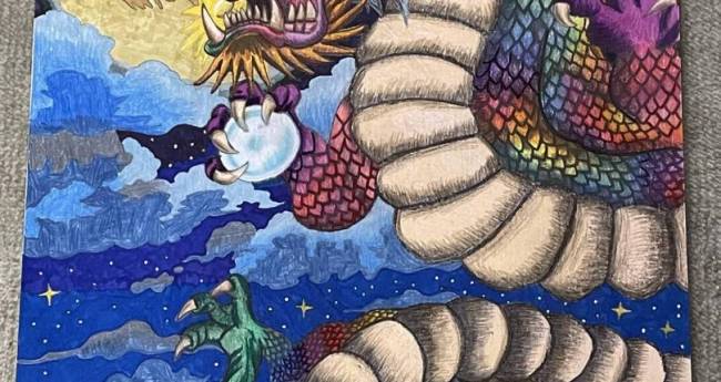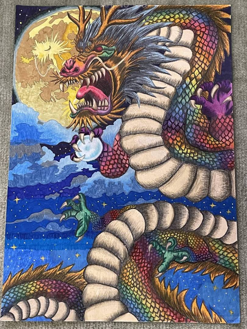 シャープペンで下書きを書いて、その後、スマホなど龍の色んな画像やイラストをたくさん見ながら工夫して色をつけました。中でも虹色のグラデーションは色鉛筆をたくさん使って色を重ねるのが大変で難しかったけど、何とか出来上がりました。