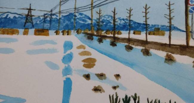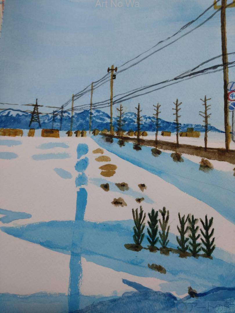 見本は自分が撮ったお気に入りの中の1枚で雲1つない青空、枯れた樹木、雪山、雪がある畑の風景写真。基本撮らないと後悔すると思うものは撮るようにしているが、写真を撮っておいてほんとによかったと思えた。それを絵にしたらどんな感じか試したくて描いた。失敗もあるが満足いく出来に仕上がったと思う。