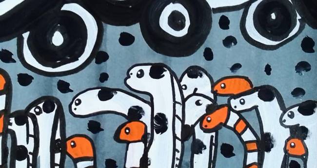 チンアナゴやニシキアナゴが並んで行列している様子を描いてみました。