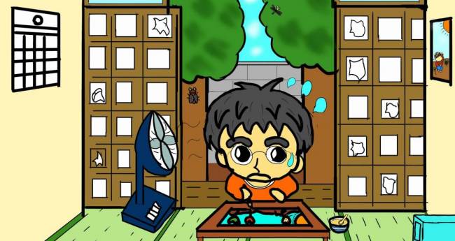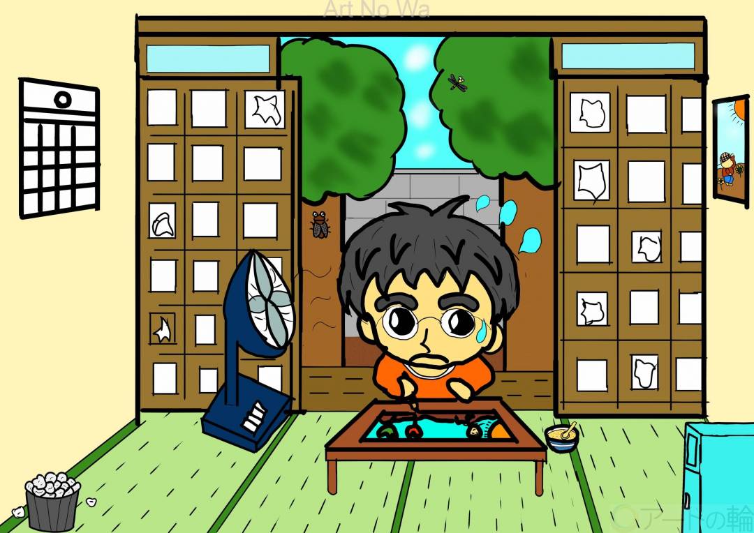 僕は今は運よくイラスト関係の在宅のお仕事で自分のペースで仕事をさせてもらい同時に障害年金をもらい裕福ではないですが、何とかグループホームで暮らせています。もし僕がまだイラストの仕事につけていなかったらどんな夏を過ごしているだろうと想像して描きました。貧乏のため洋室には住めず畳の和室ですごしており、またエアコンもなく安く買った扇風機とアイスで夏の暑さをごまかし、必死でイラストで賞をとることにイラスト制作に夏の暑さに負けないぐらいの熱さで励んでいる、そんな姿を想像して描きました