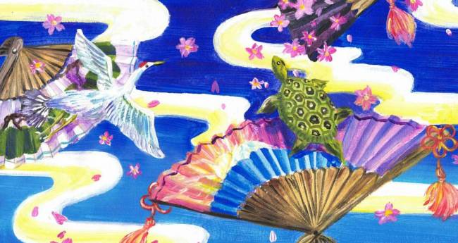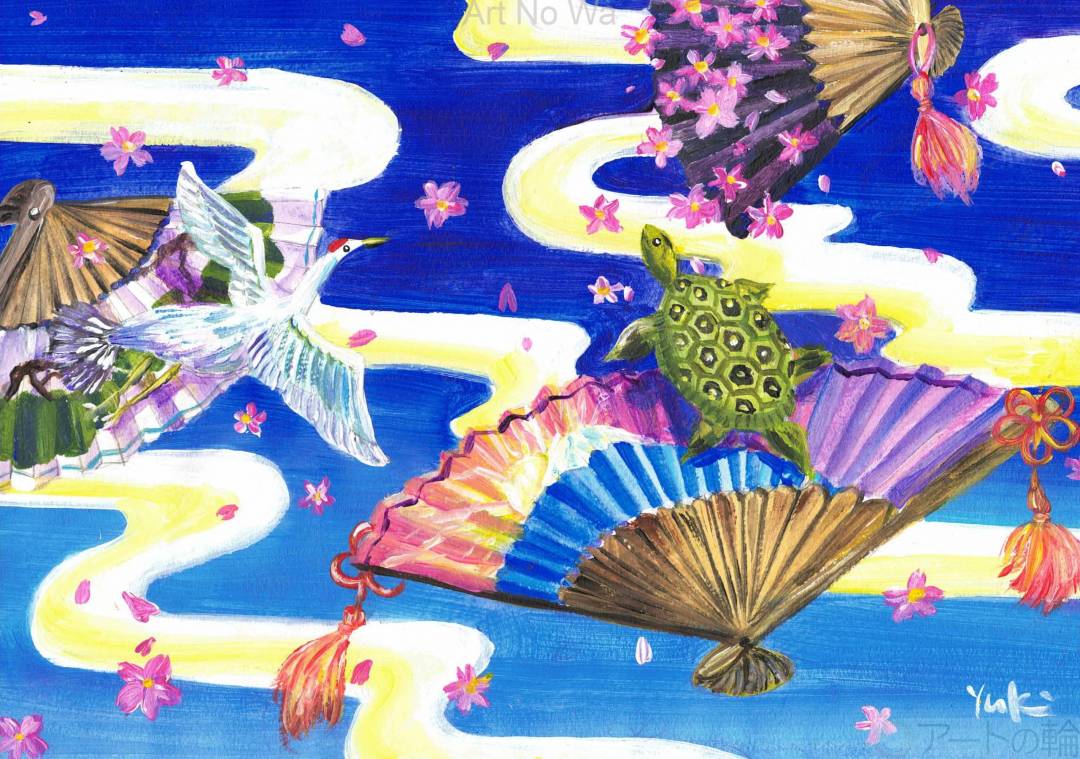 扇子がまるで舞っているかの様に、ふわふわと落ちていき、その中の絵柄の桜・鶴・亀が飛び出しています。不思議な世界を描きました。