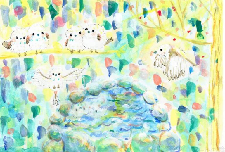 大好きなふくろうたちを描きました。あふりかおおこのはずくがおきにいいりです。この絵を見た人にしあわせがいっぱい訪れます様に。