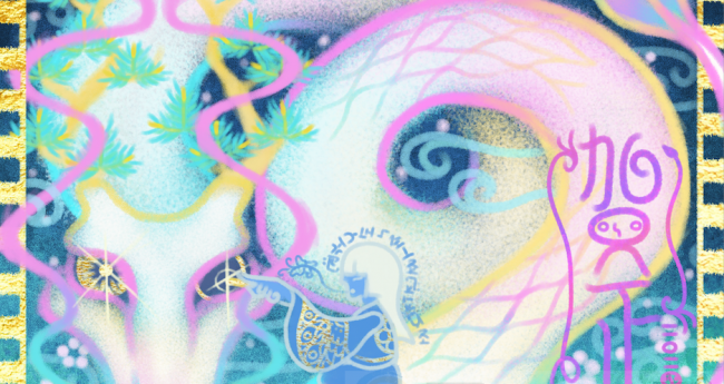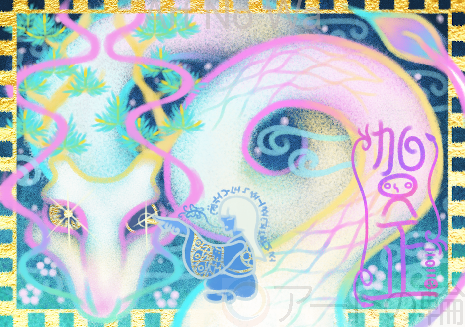 がりうのごとき りうのめの うちなるあしき てまねくさけめを えんにかえては せんりまで いのるごんなり みちびくみなもと ちのとかげ てんのはは ゆくとしのあしを くるとしのよしに みなもとはみたま ちからのかげり てらすひかりよ ゆくとしのあしを くるとしのよしに みちたがえずに ちからをよきに てんじますよう ゆくとしのあしを くるとしのよしに (訳◈画竜の如き美しい 竜の目にある 内なる悪い心を 手まねく裂け目を 円に変えて 千里まで届くよう 祈る時の言葉 我等を導くその源は 地に居るトカゲ 天の母親 行く年に起きた悪しき物事を 来る年の善き物事へ その源は我等の魂 それの力の悪い部分を 照らし浄化する光よ 行く…(中略) 道を違えずに その力を善き方向に 転じますように 行く…(中略)(描画ソフト Medibang Paint Pro使用)