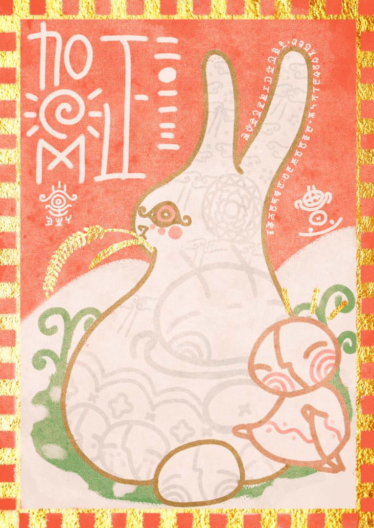 はるよきたまえ ひろきのに ふくきたるかぜ へいおんの ほのこことほぐ ひのめこちらに▼▼▼▼▼▼今年の干支でございます「うさぎ 」は、子孫繁栄、商売繁盛、春の象徴とされています。繁栄を呼ぶうさぎと子どもの精霊ワラワゴノミコ(右下)との暖かな戯れは、まさしく親子のようでございます。ワラワゴノミコがうさぎの体をなぞって描かれたその絵は、春の太陽の下で伸び伸びとしている赤子みたいです。どこかで見たような形、いや漢字のようです。またその下にはしれっとうさぎの体温で暖をとっている自身とお友だちの御姿が。いくらおしりが暖かそうとはいえ、にわとりじゃあないんだから…(描画ソフト Medibang Paint Pro使用)