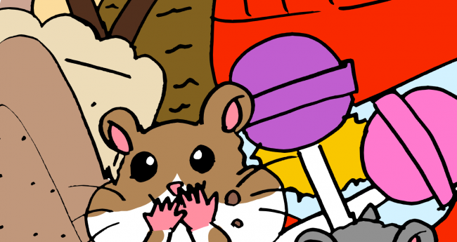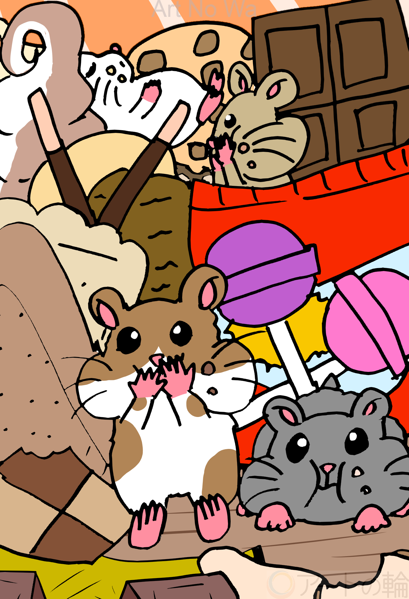 お菓子を沢山食べているハムスター達を描いてみました。