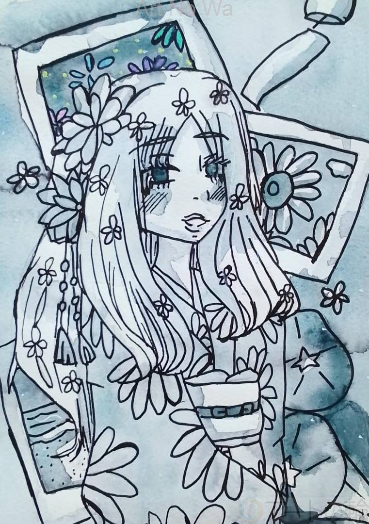 夏の思い出を写真で振り返っている女性を描いてみました。