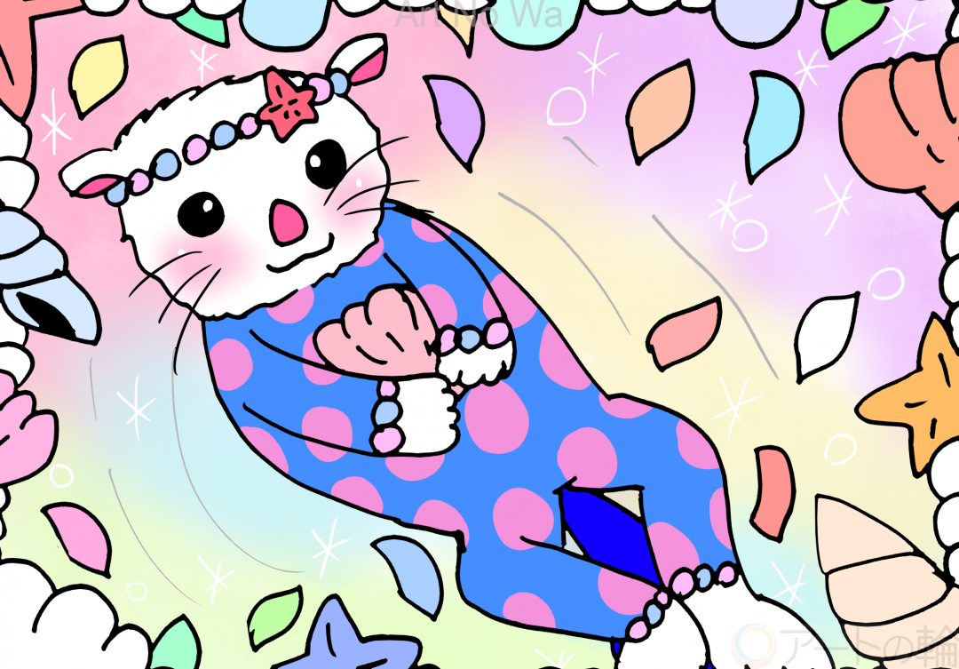 大切な宝物の貝殻を抱きしめて泳いでいるラッコを描いてみました。