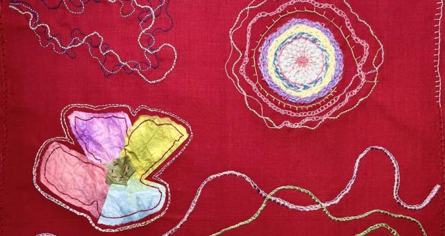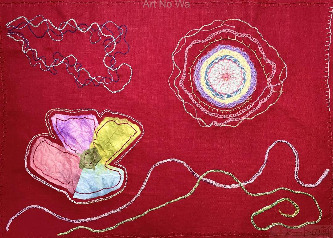 地球の中での命の輪。母の着物地を土台に、糸と和紙で、表現しました。感謝の気持ちです。