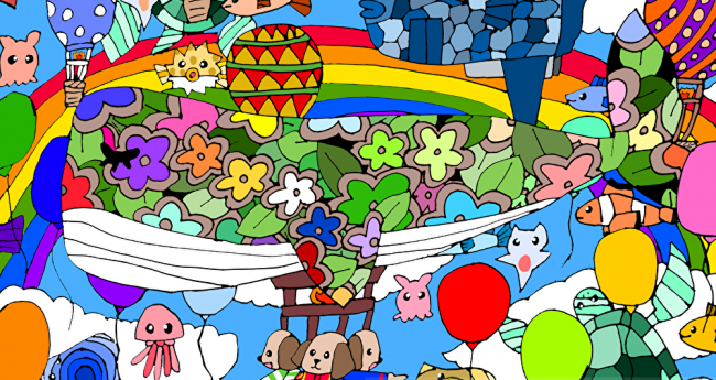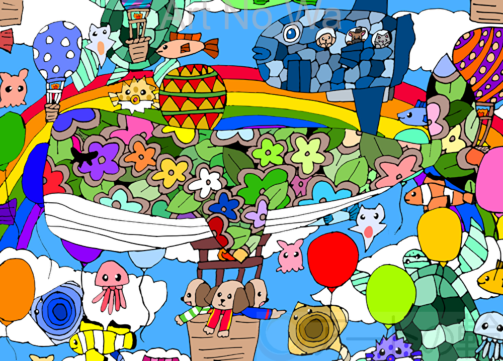 戦いも争いもない生きているものみんなが無限に平和でありますように。という願いを込めて明るくカラフルに描きました。また、海の生き物を気球にしたり空を飛んでたりといろんな生き物がみんなが楽しくしている感じに描いてみました。