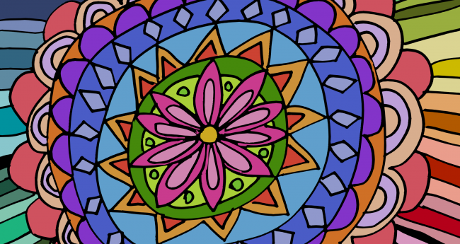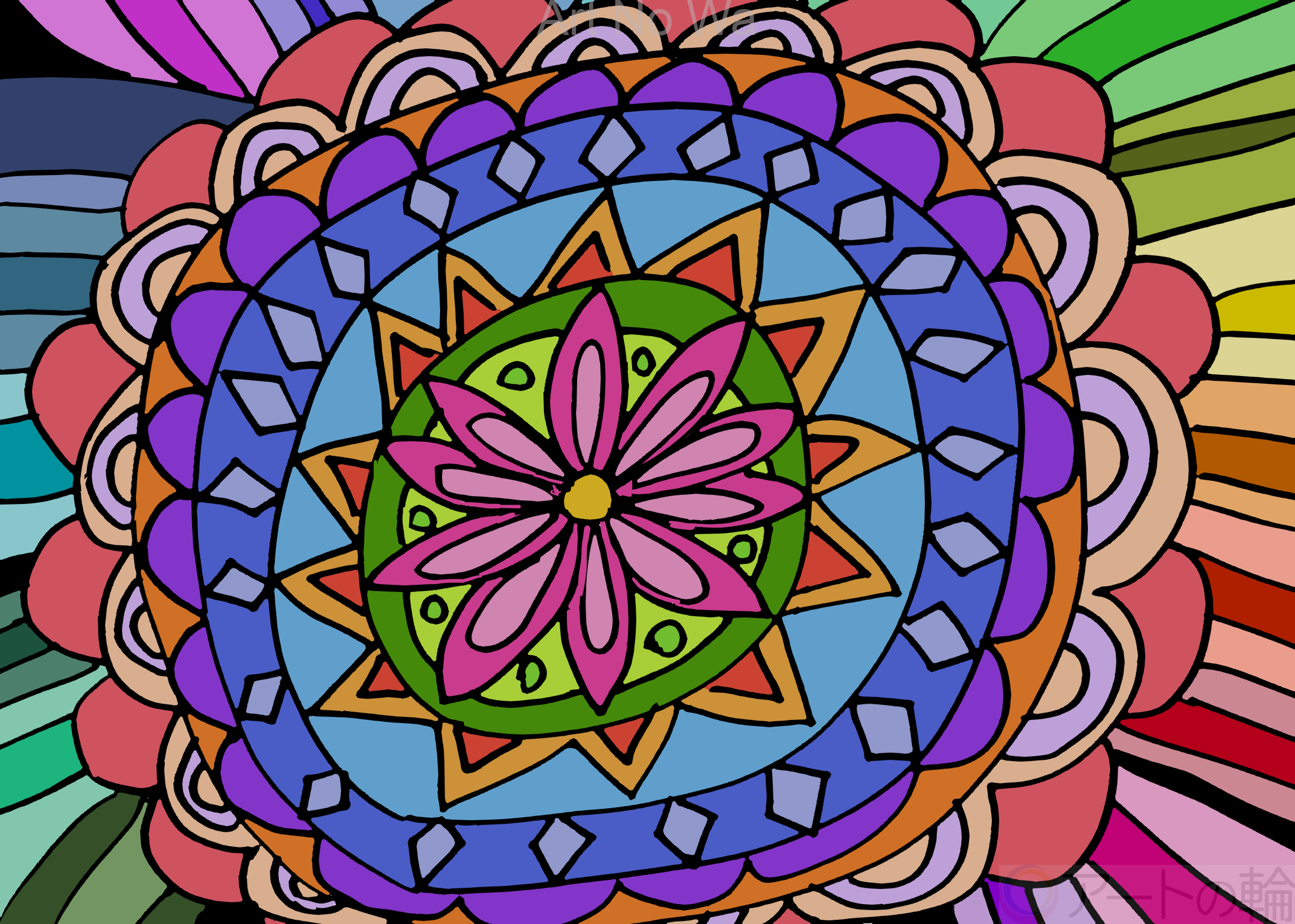 色んな色で花を中心に曼荼羅っぽい模様を描いてみました。