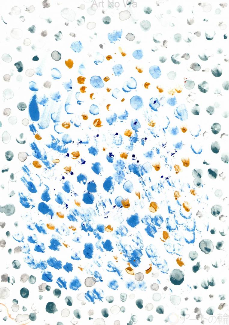 指で絵の具を塗っていき、その模様が自分の好きな炭酸水のように見え、絵を描き進めていきました。炭酸水の気泡が、湧き上がってくるアイディアや可能性のようにも感じました。今後炭酸水を飲むと、良いアイディアが生まれ可能性がひろがっていくと嬉しいです。A4サイズに描きました