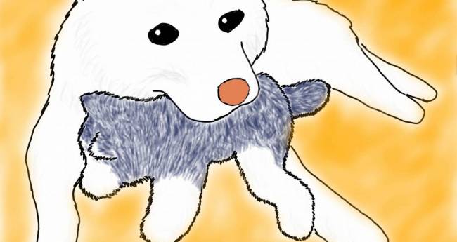 大好きなぬいぐるみを確保する秋田犬を描きました。