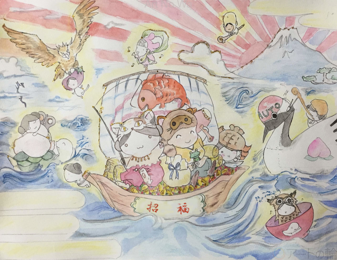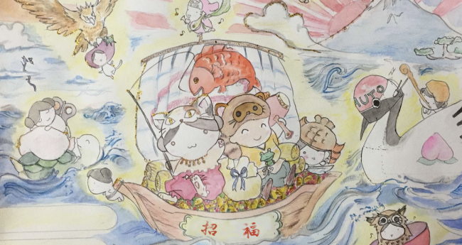 七福神、ふくろう、無病息災、昇龍、タヌキ、鶴亀、幸運のオス三毛猫、粘り強いもちなど、めでたいものをたくさん詰め込みました!