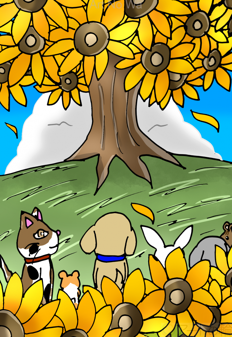 木に沢山咲いている向日葵を沢山描いてみました。