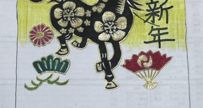 黒や深緑やえんじ色で落ち着いた色合いのちょっと大人っぽいシックな正月にしました。金のペンで線を書いて、金色の背景で少し高級感あるように仕上げました。馬を花柄にして少し華やかさがあるようにしました。