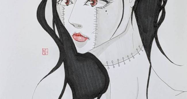 美人画描きたくなりましたが、ただの美人画で飽き足らず、つぎはぎを付けてしまいました