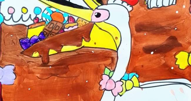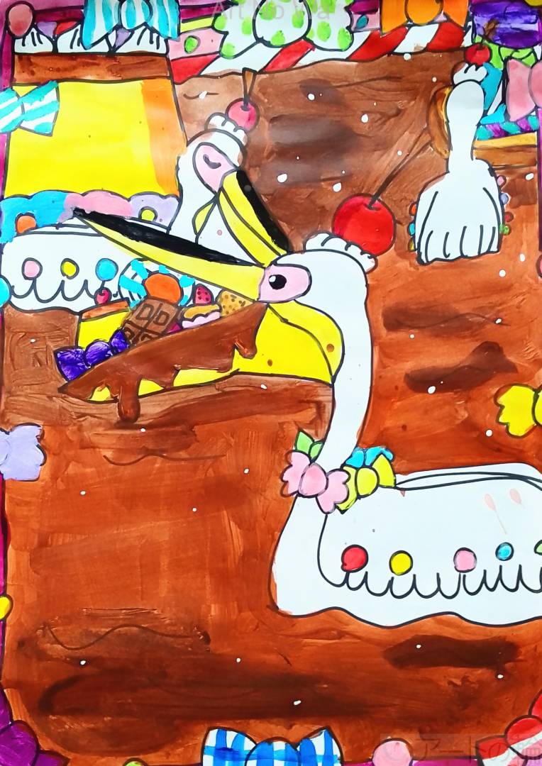 色んなお菓子が浮いているチョコレートの湖を描いてみました。ペリカンも楽しそうです。