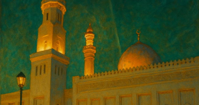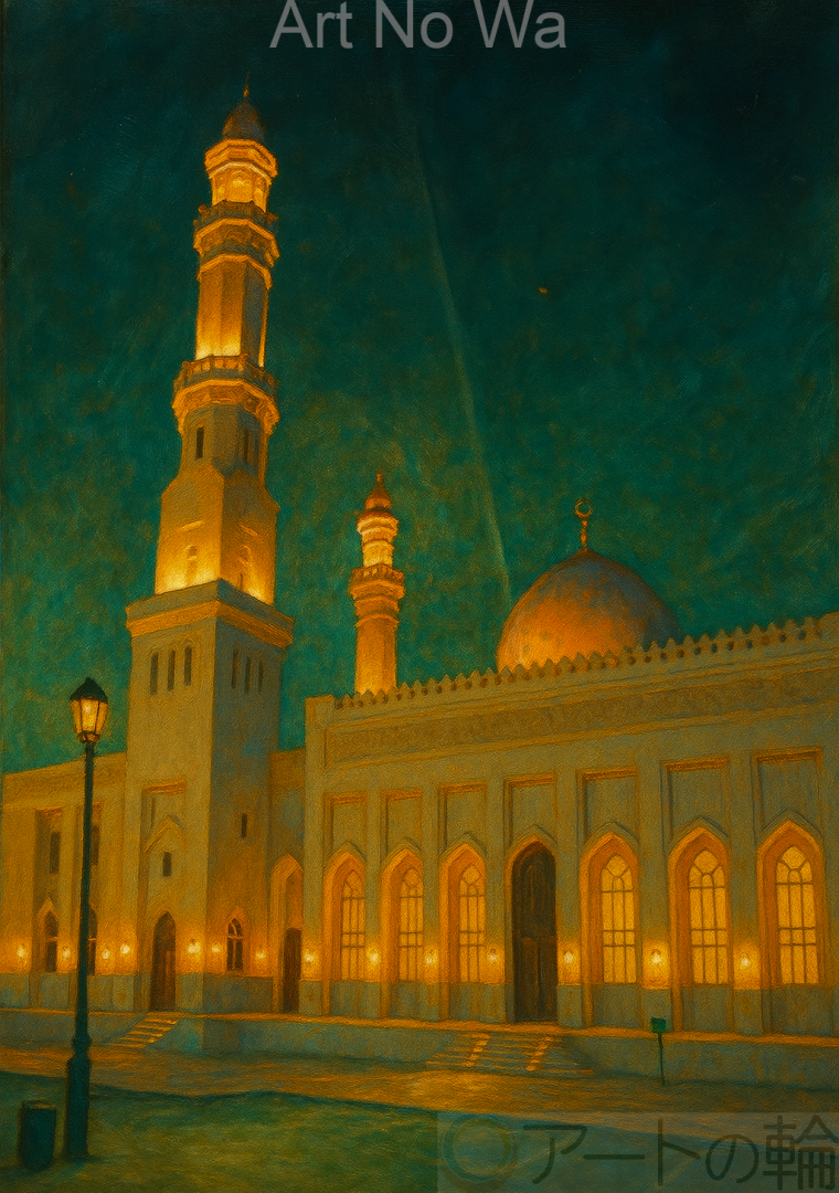 オマーン・マドハ。その静寂の中に浮かび上がる「スルタン・カブース・モスク」は、白亜の壁面が月光と街灯にやさしく照らされ、まるで大地に佇む幻のように映ります。実際にこの地を訪れた体験をもとに、夜の静けさ、信仰の重み、そして建築の繊細な美をひとつの画面に凝縮しました。煌びやかさではなく、祈りの本質に寄り添うその佇まいが、多くの人の心に深く響くことでしょう。