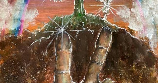 この作品は、SDGsの17の目標のなかの、目標16・平和と公平を全ての人に をイメージしました。芽吹く新芽が大きくなってやがて木になり、葉を繁らせるとき、皆に平等に木陰を作って休む場所を与えて欲しい、そして「ボク」も平和で公平な世の中を作るよと宣言するように掲げたピースサインが印象的な絵です。