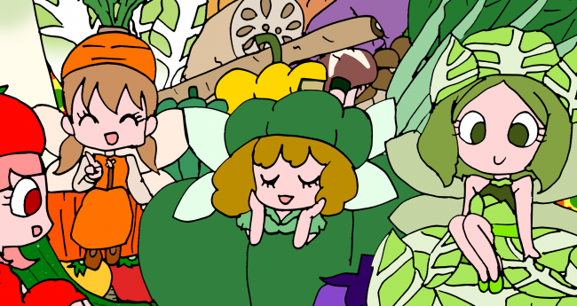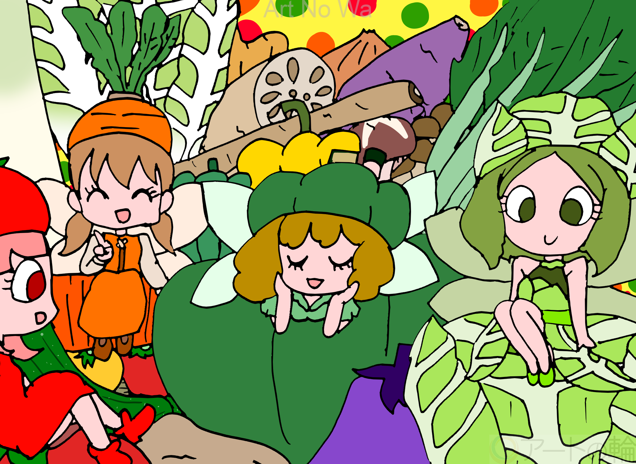 色んな野菜の妖精の女の子が女子会をしている様子を描いてみました。