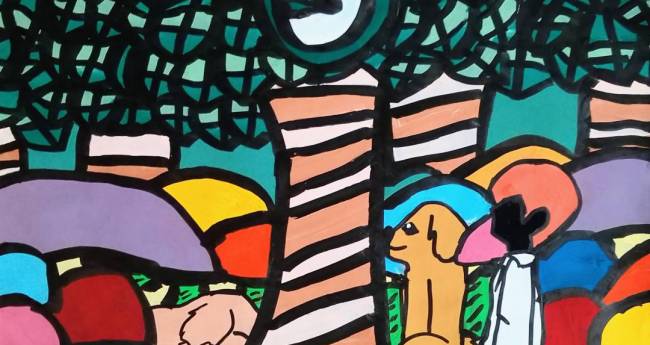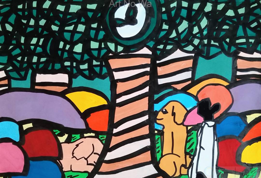 キノコだらけの森林に迷い込んだ犬と男の子に時刻を知らせている木を描いてみました。
