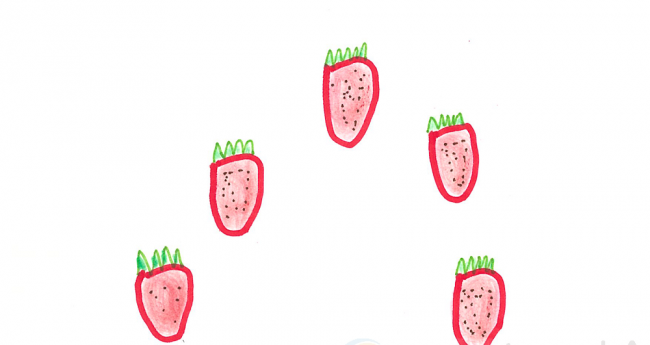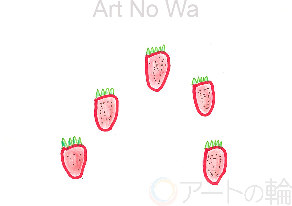 いちごをアーチ状に描いてみました。いちごの形に変化はないですが、赤い色を2色使って重ね塗りするところを工夫しました。