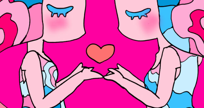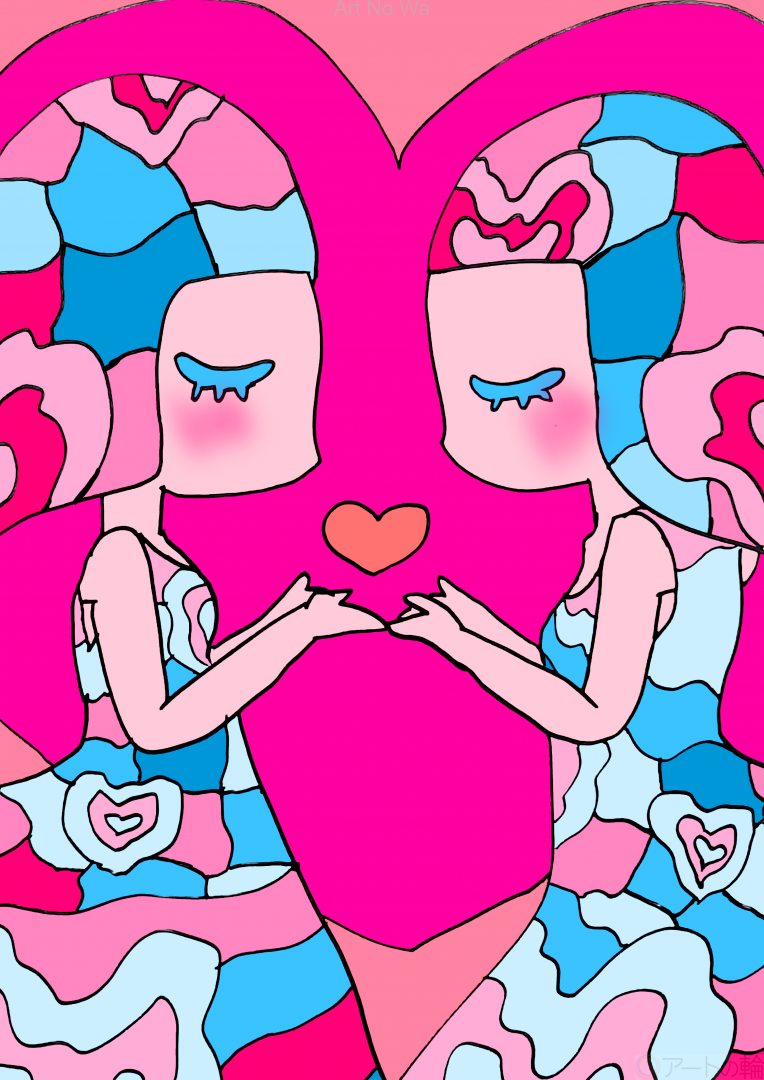 お互い見つめあいながらハートを見守っている女性を書いてみました。